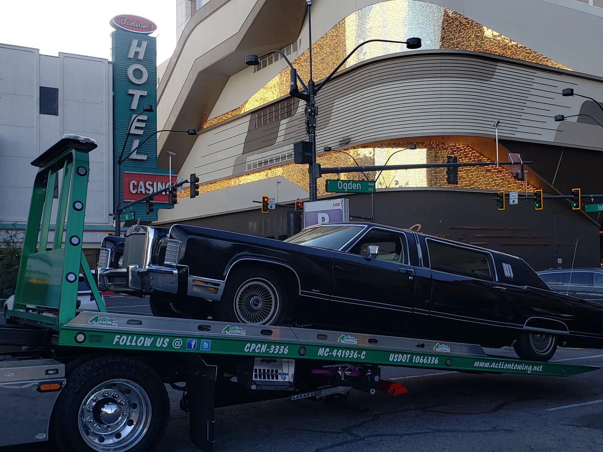 From the town where truth is always much stranger than fiction, Jonathan Warren and Liberace Garage present this mob classic. We call her "The Dark Side." She's an extremely rare, 1977 Lincoln Town Car Limousine. 7.5L V8 (2 valves per cylinder), 4-Barrel Motor-Craft 4350 Carburetor, 208 HP and 22 feet long. This car has been rented by celebrities including George Clooney.