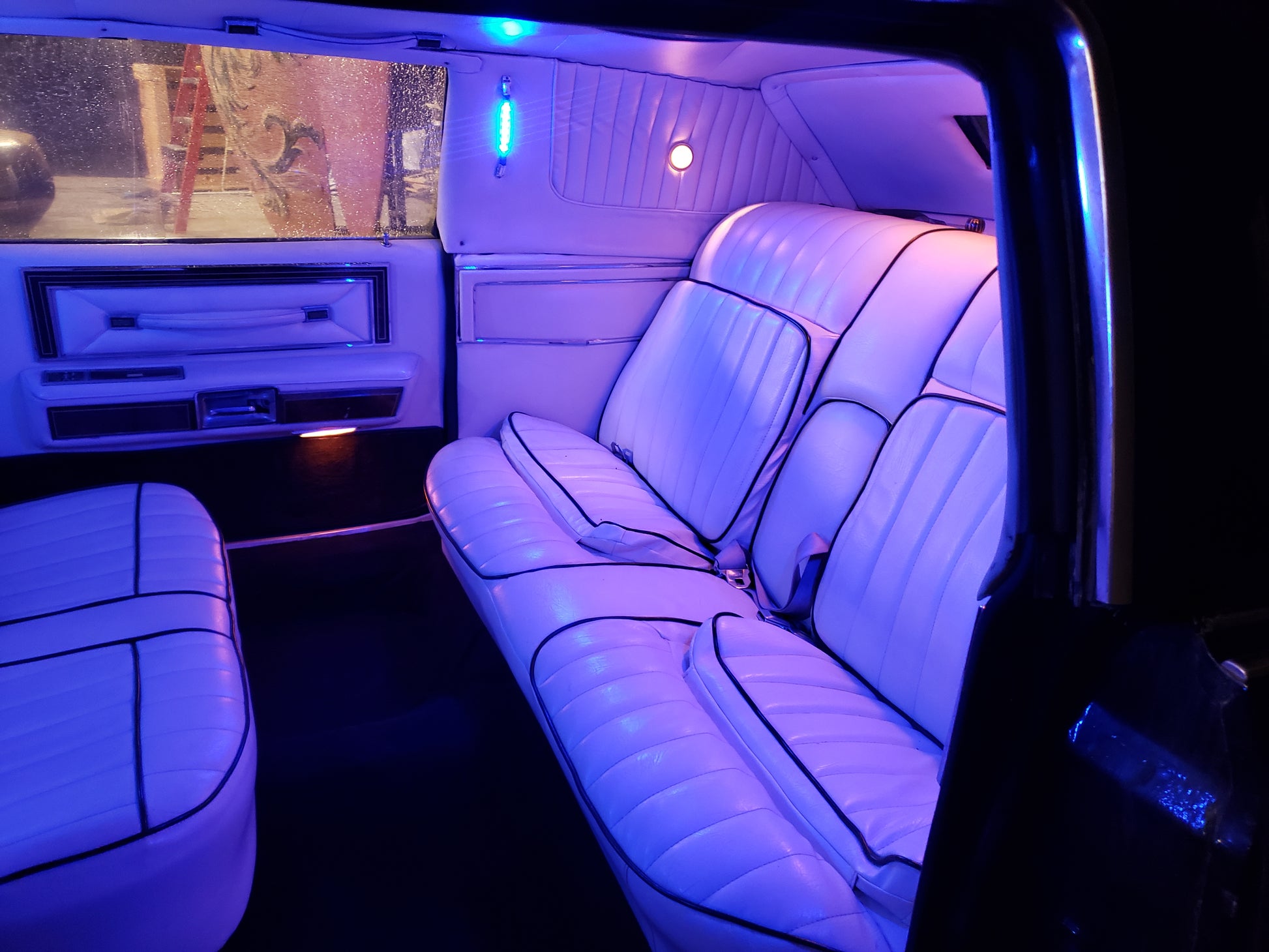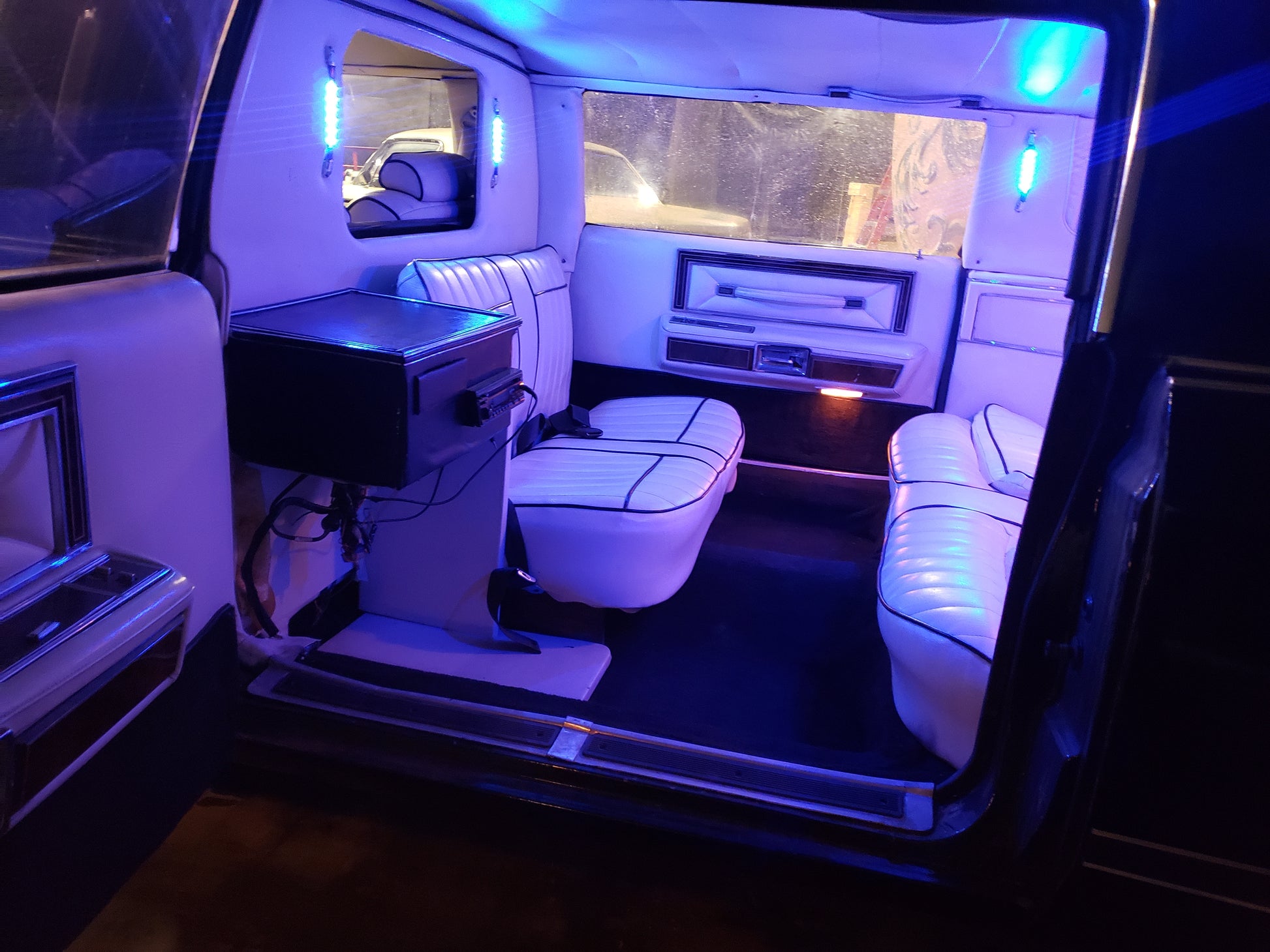 There are 4 belted seats facing each other in the rear, staggered for leg room. Driver's cockpit has a retractable privacy shield. Auxiliary air conditioning brings her up to date in the desert of the 21st century. Room for at least 4 bodies in the trunk, or the groom if he puts up a fight.