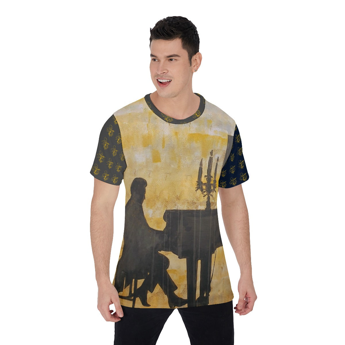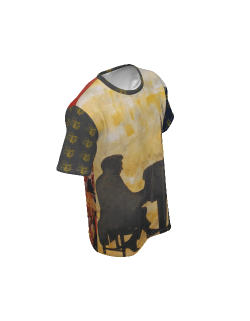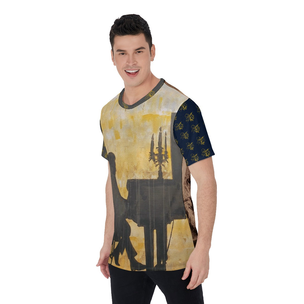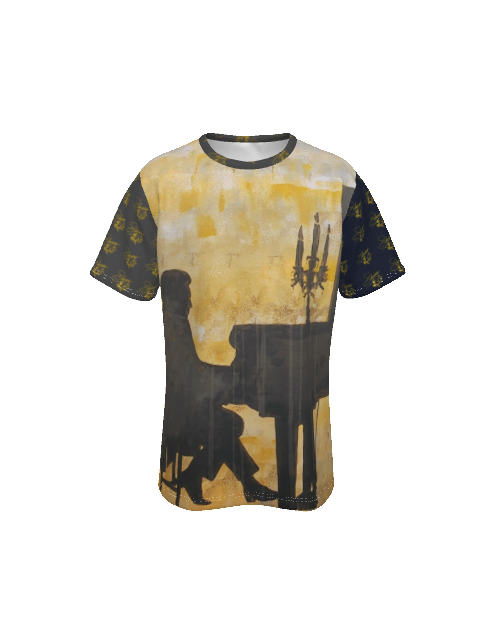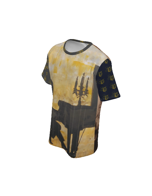 SLEEVES: Shorts sleeves are black, patterned with Liberace Piano Signature Logos.