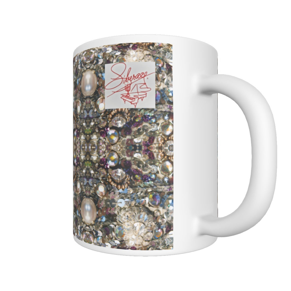 The unbeleivable beaded textile of an actual liberace costume is photographed in detail to wrap this mug. One of several mugs, collect them all!
