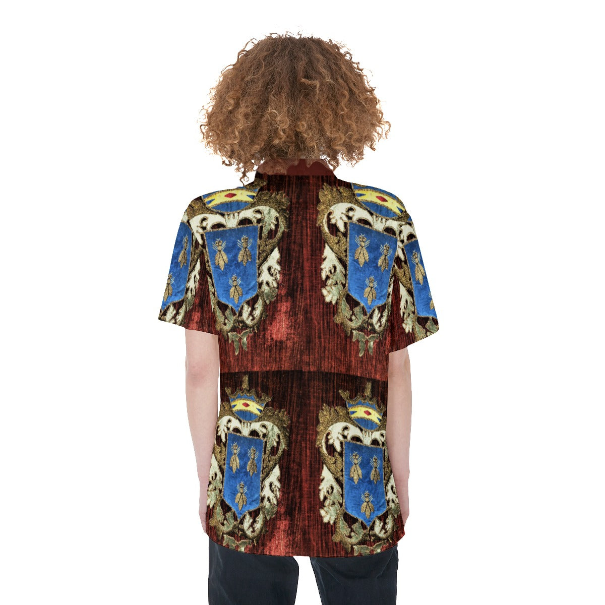 A high resolution photo of Napoleon's crest on a famous Liberace artifact in the Liberace Museum Collection makes up the pattern of this blouse.