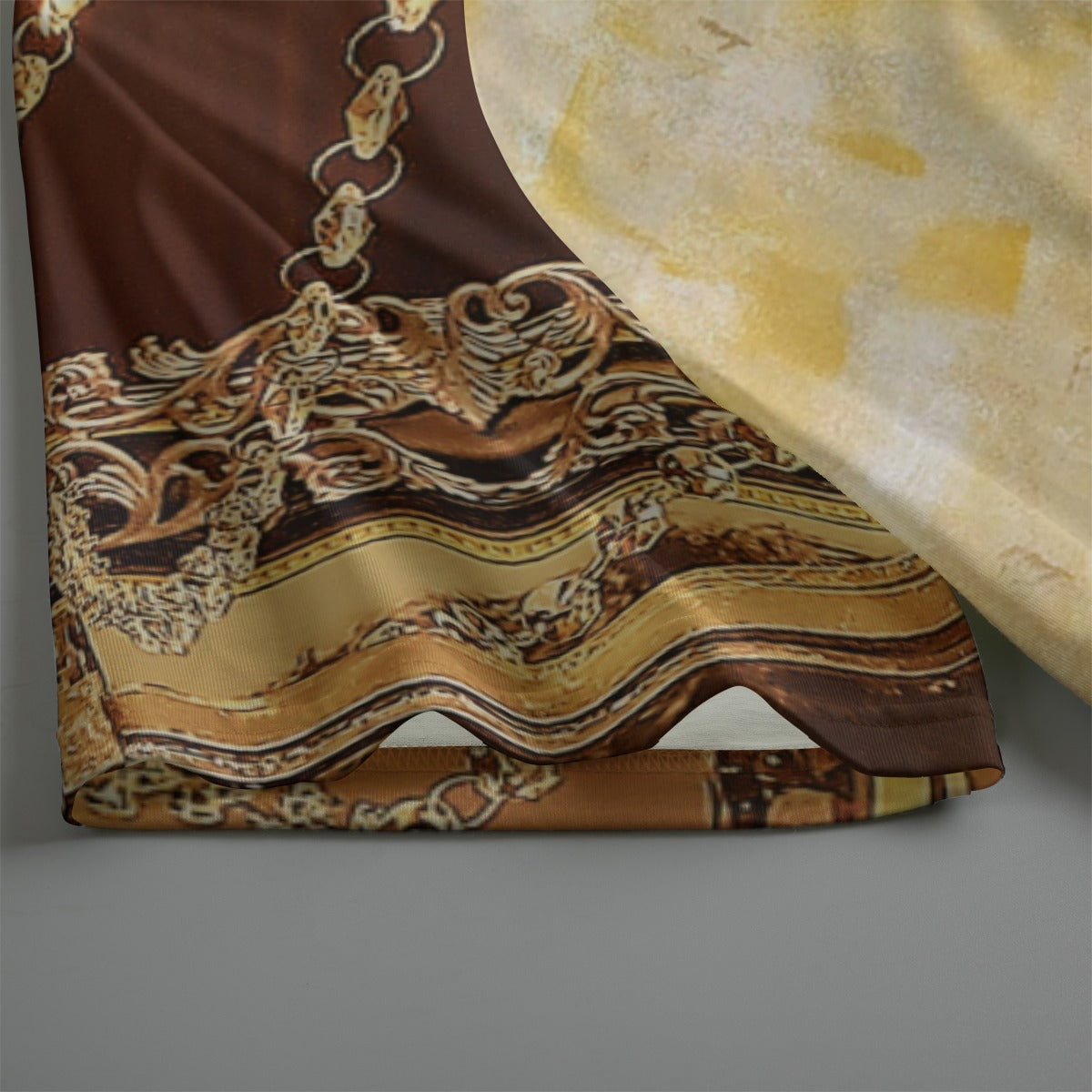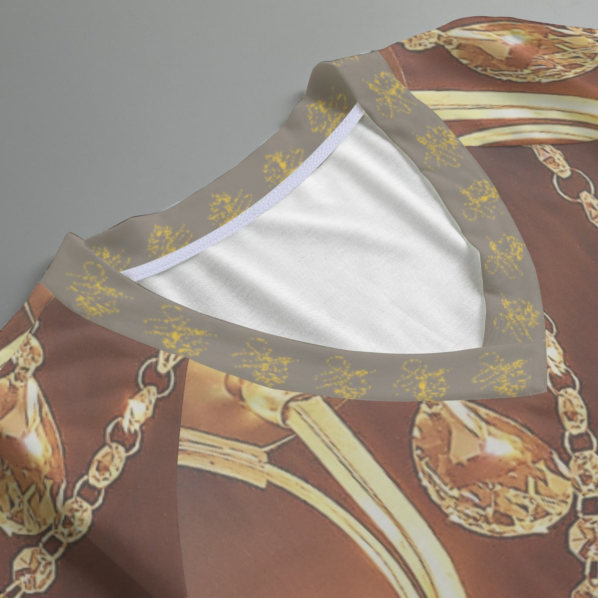FRONT: A view through a golden chandelier to a partial of a 1950's Liberace portrait. The V-neck collar has the Liberace Piano Signature Logo pattern.