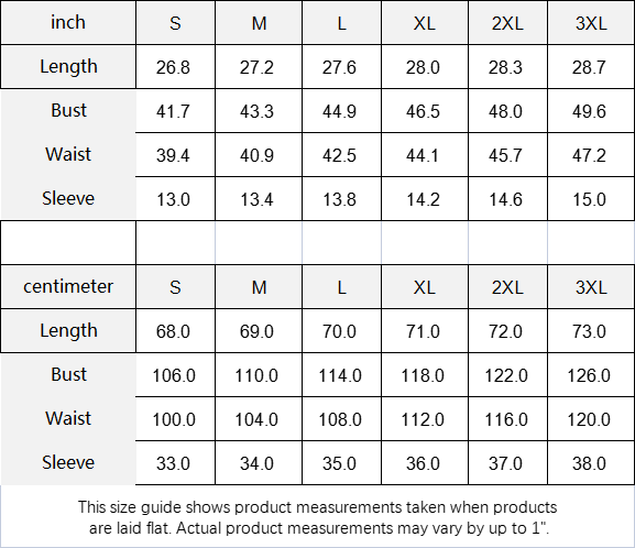 This size guide shows product measurements taken when products are laid flat. Actual product measurements may vary by up to 1".