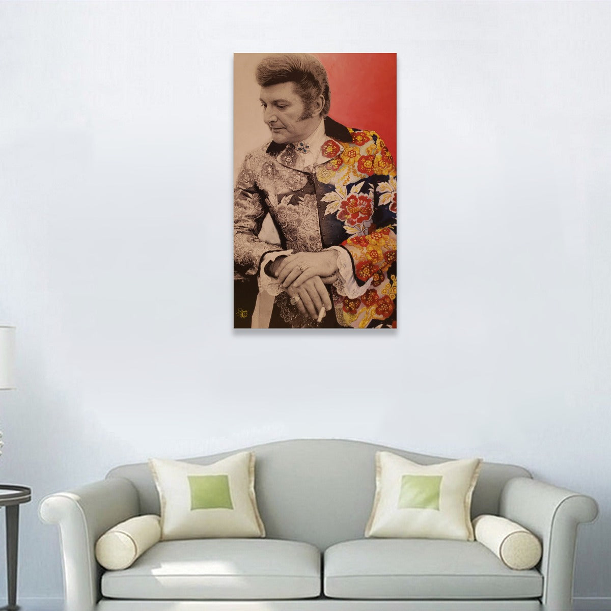 "Dichoterace" is the 2020 Giclee/photo painted photo by Jonathan Warren, based on the 1968 black and white photo of Liberace by Allan Warren. This painted version takes straddles the subject between the color and black and white worlds, depicting original colors of his jacket created by famed costume designer Nudie Cohen. The piece recalls Liberace's life as rich in dichotomy. The original began hanging in the lobby of the Conrad Hotel at Resorts World Las Vegas, celebrating the history of Liberace with Baron Hilton.