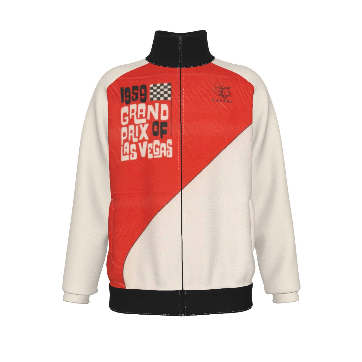 The front of this water resistant jacket is the brochure from the 1959 Las Vegas Grand Prix. A Liberace Garage logo has been added to the upper breast. On the back is a copy of an early race advertisement for Las Vegas Park. Below the vintage ad is the hash tag #LVGP with the establishment date of the Grand Prix, and the Liberace Foundation slogan, "You can't fake a legacy."