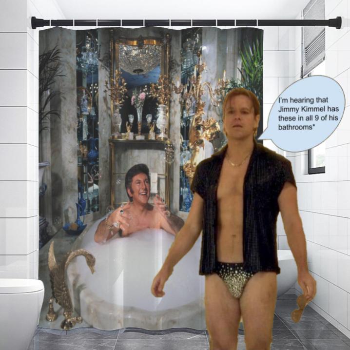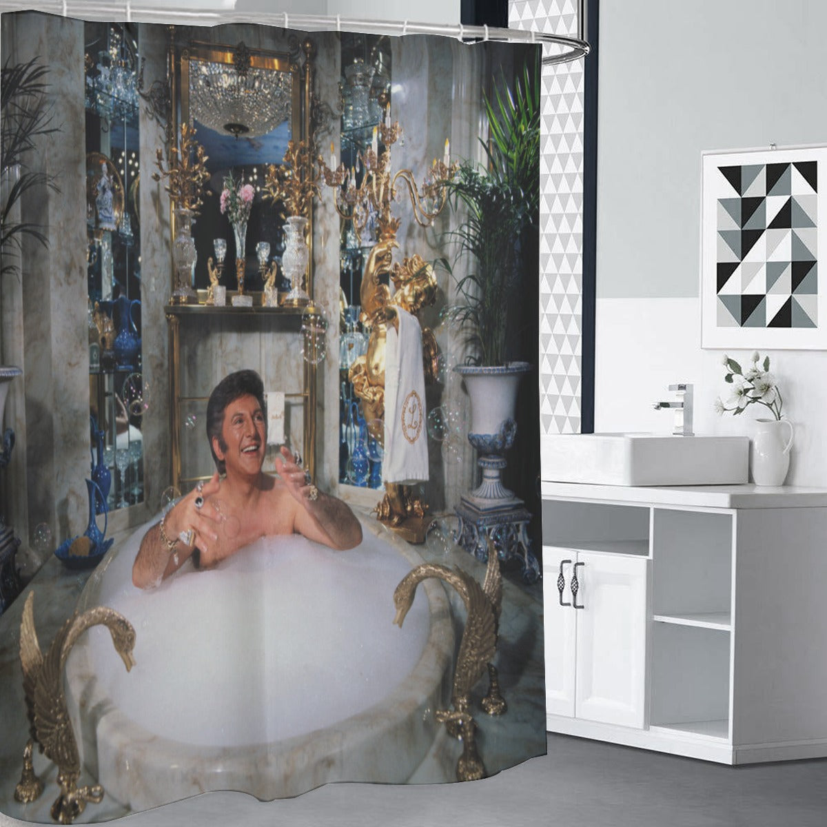 Liberace bathtub photo print shower curtain. A legendary Liberace publicity photo, taken in the famous bath tub of his Las Vegas home, becomes the life-size print on your new polyester fabric shower curtain. It's Liberace in your tub! Thick, vividly printed, includes hanger rings. One of our most popular products!