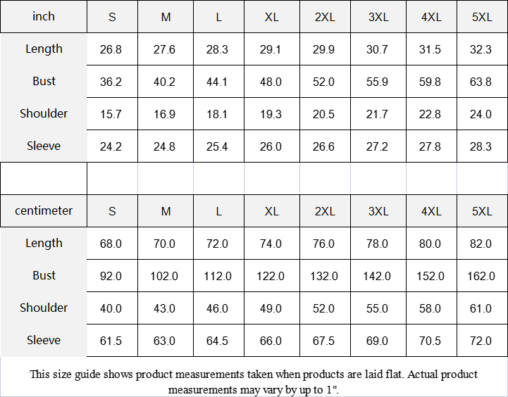 | centimeter | S | M | L | XL | 2XL | 3XL | 4XL | 5XL |