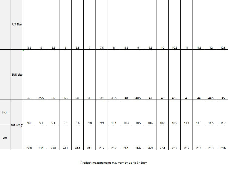 | EUR size | 35 | 35.5 | 36 | 36.5 | 37 | 38 | 39 | 39.5 | 40 | 40.5 | 41 | 42 | 42.5 | 43 | 44 | 44.5 | 45 | |