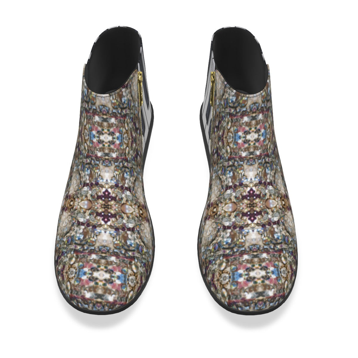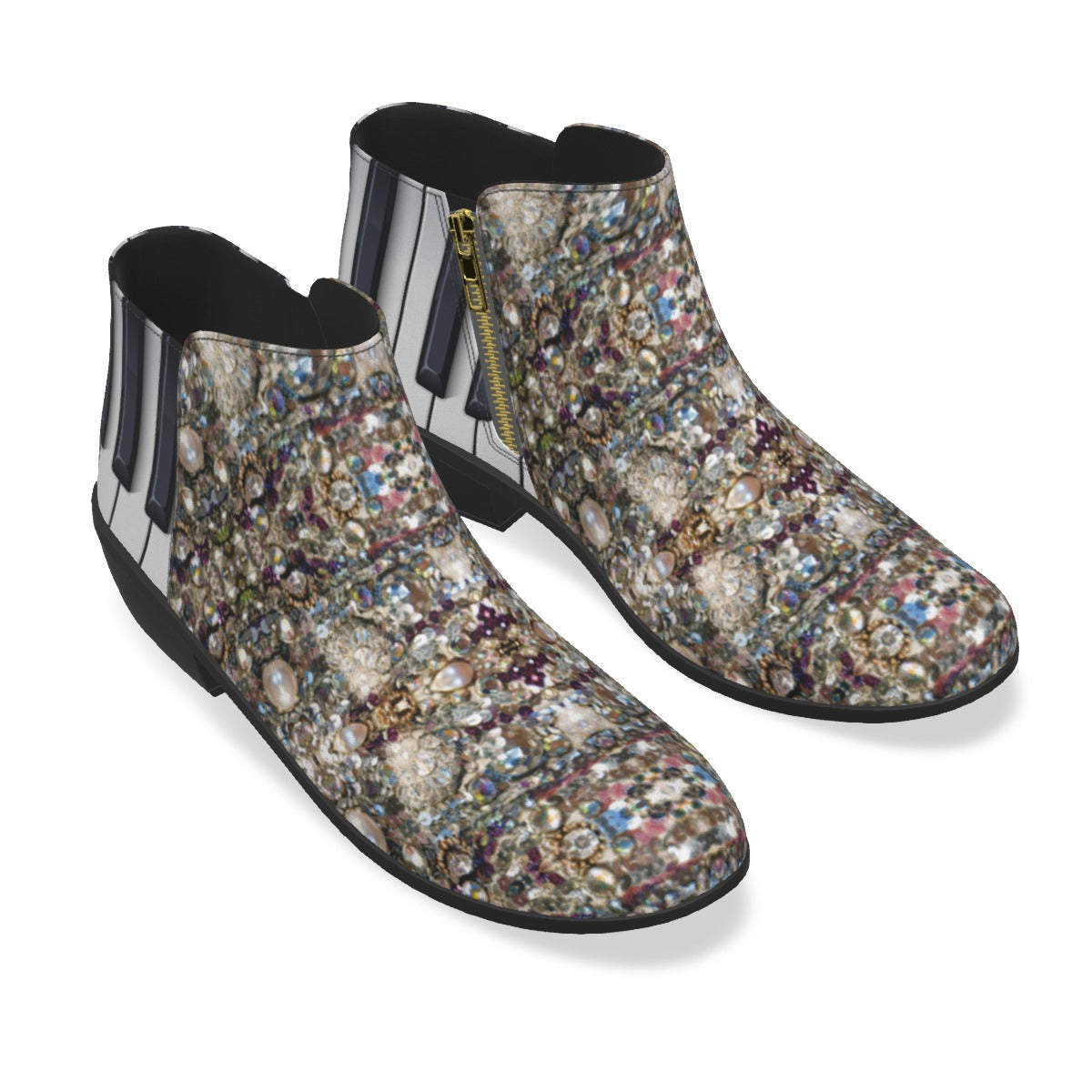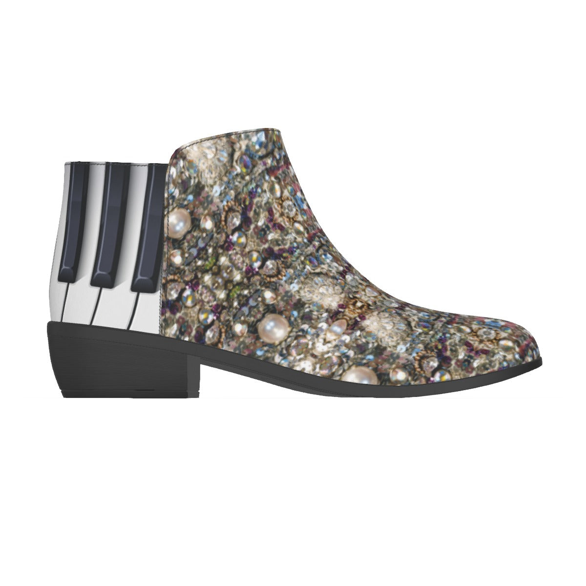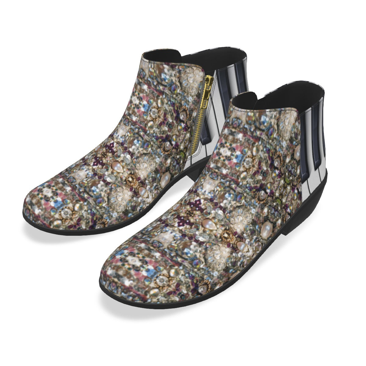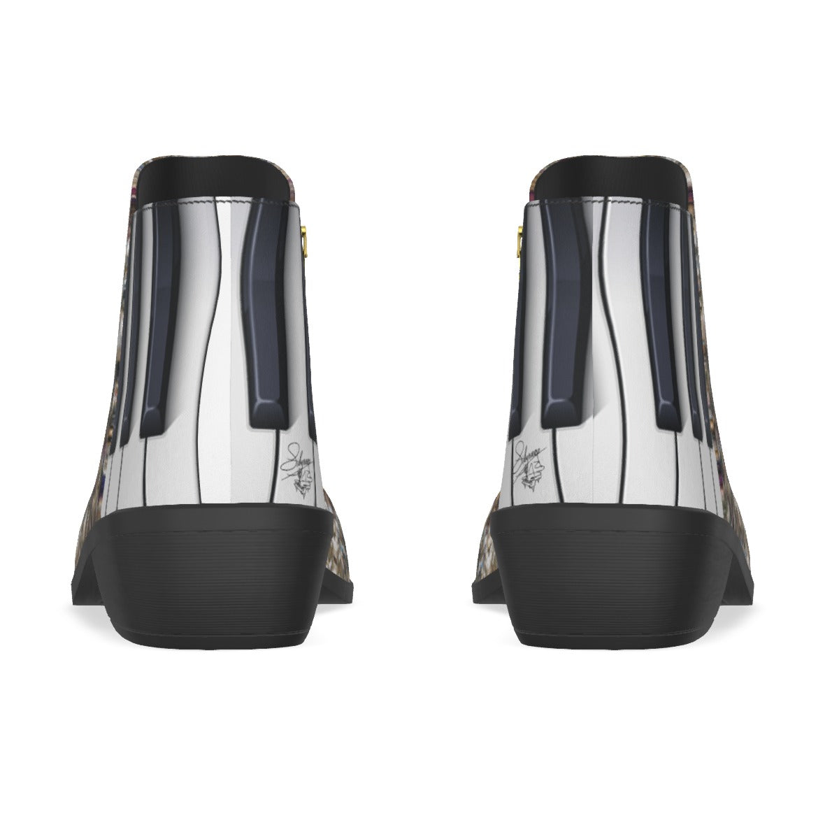 An actual Liberace costume copyrighted photograph in high definition creates the stunning graphic design of these fashion boots. The upper heal panels are piano keys, with a subtle Liberace Piano Signature Logo on the instep heal.