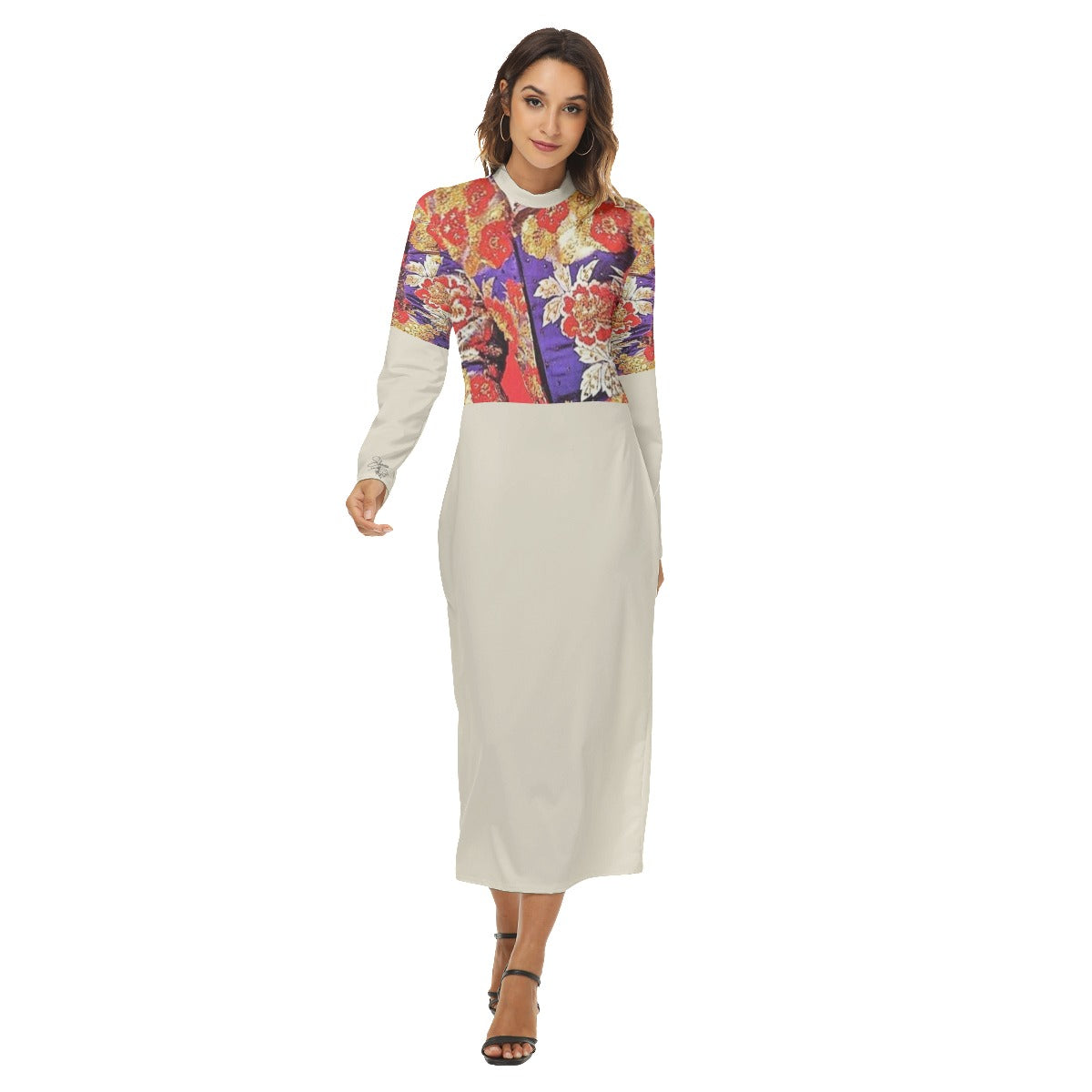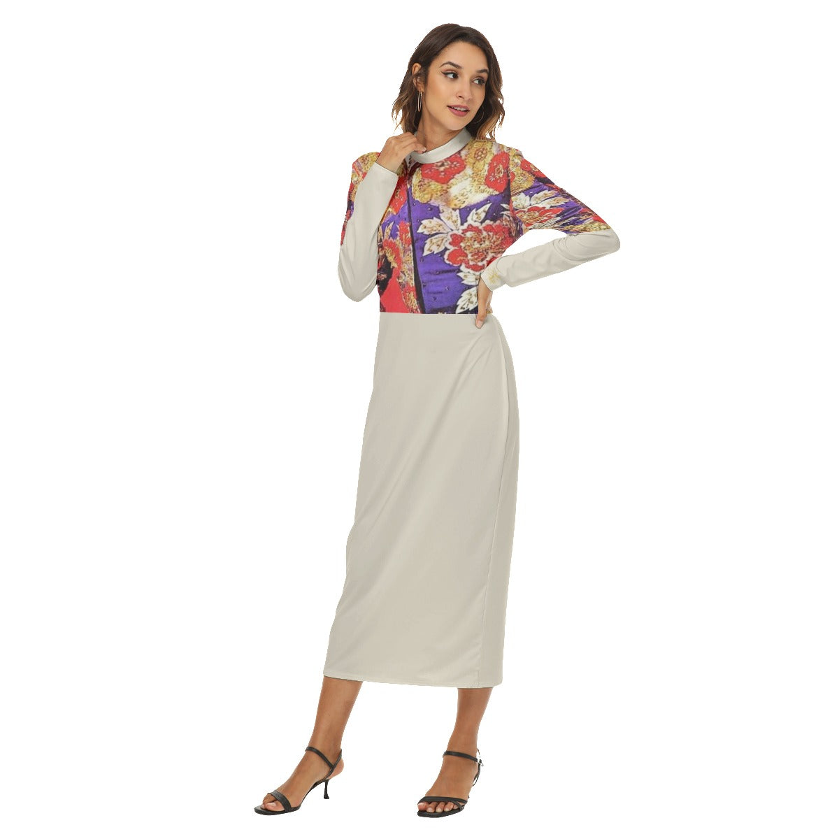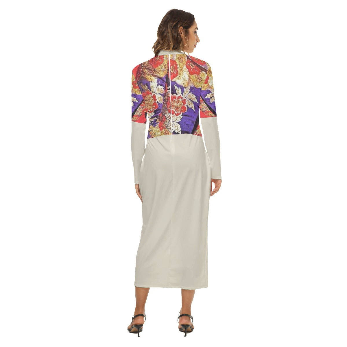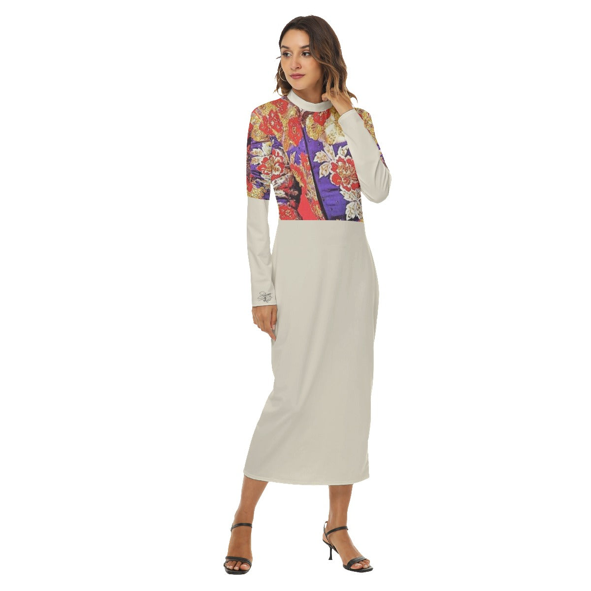 A print of Liberace's 1968 Nudie Cohn-designed jacket adorns this light turtleneck, long sleeved dress. Close-fitting hip skirt with zipper, Either side can be worn as the front.