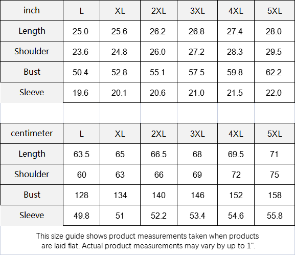 | inch | L | XL | 2XL | 3XL | 4XL | 5XL |