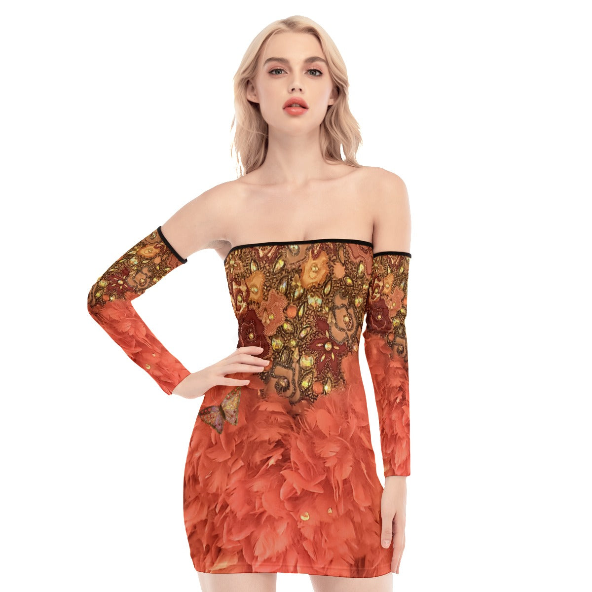 This fitted, short dress is wrapped in an original, copyrighted photo of that Liberace Radio City Cape, taken in 2022. The papillon (butterfly) which is on the chest, shows on the right hip of the dress. Long, detached sleeves leave the shoulders bare. An absolutely unique, head-turning piece.