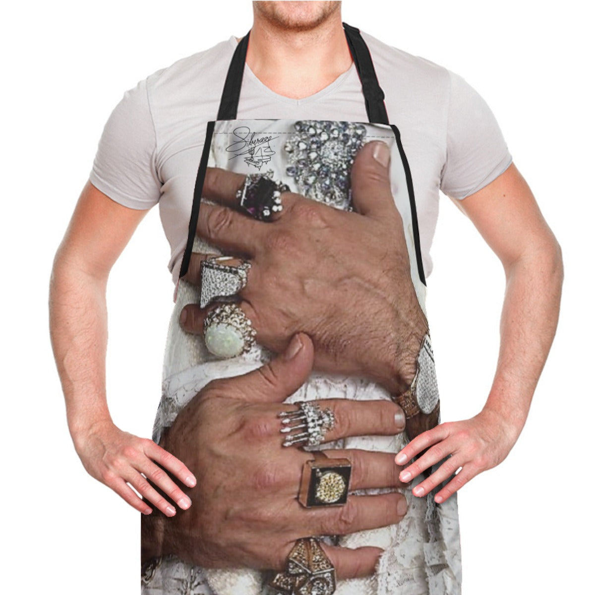 The famous 1981 photo of Liberace's bejeweled hands by Annie Leibovitz makes up the entire front of this Apron, with the signature piano logo at top right.