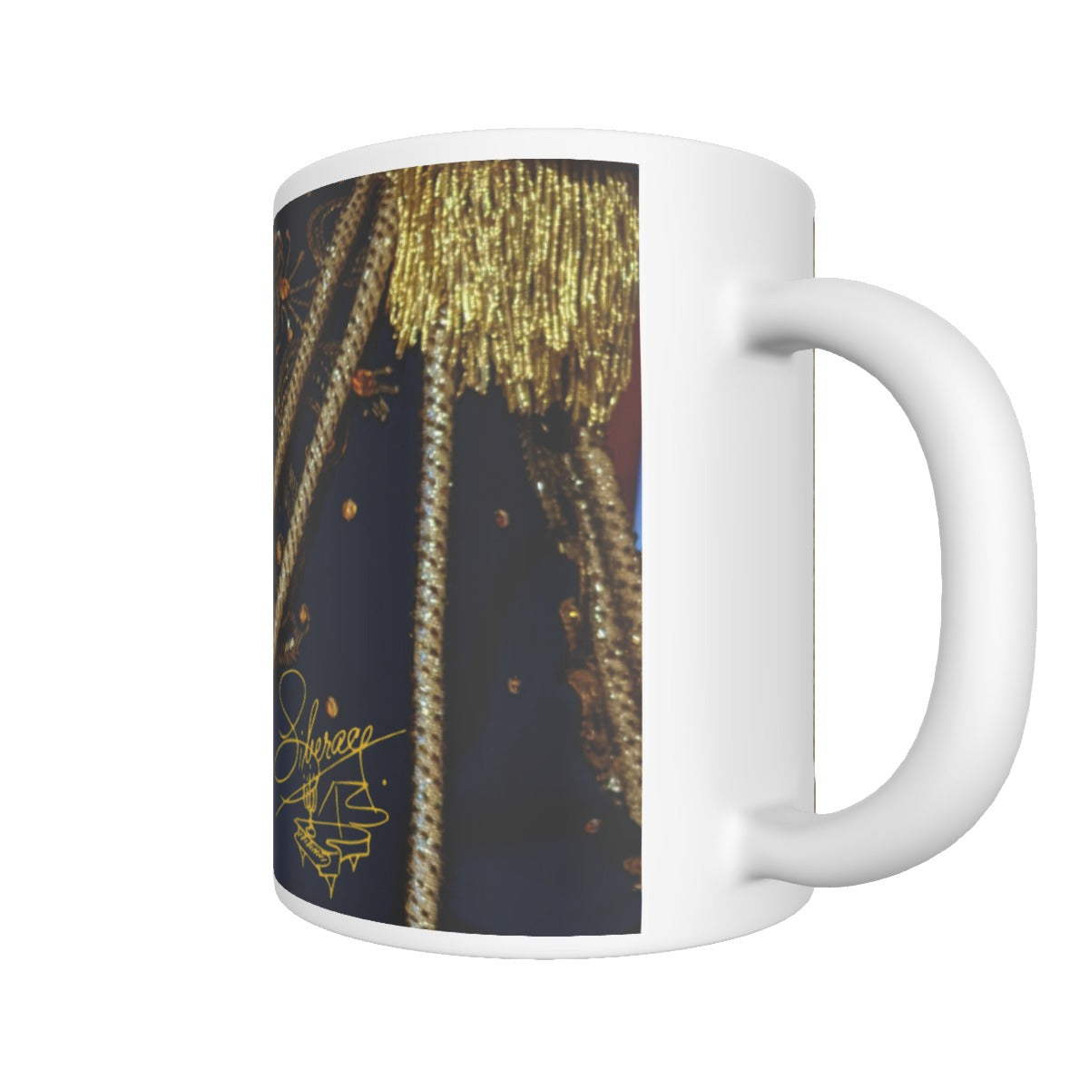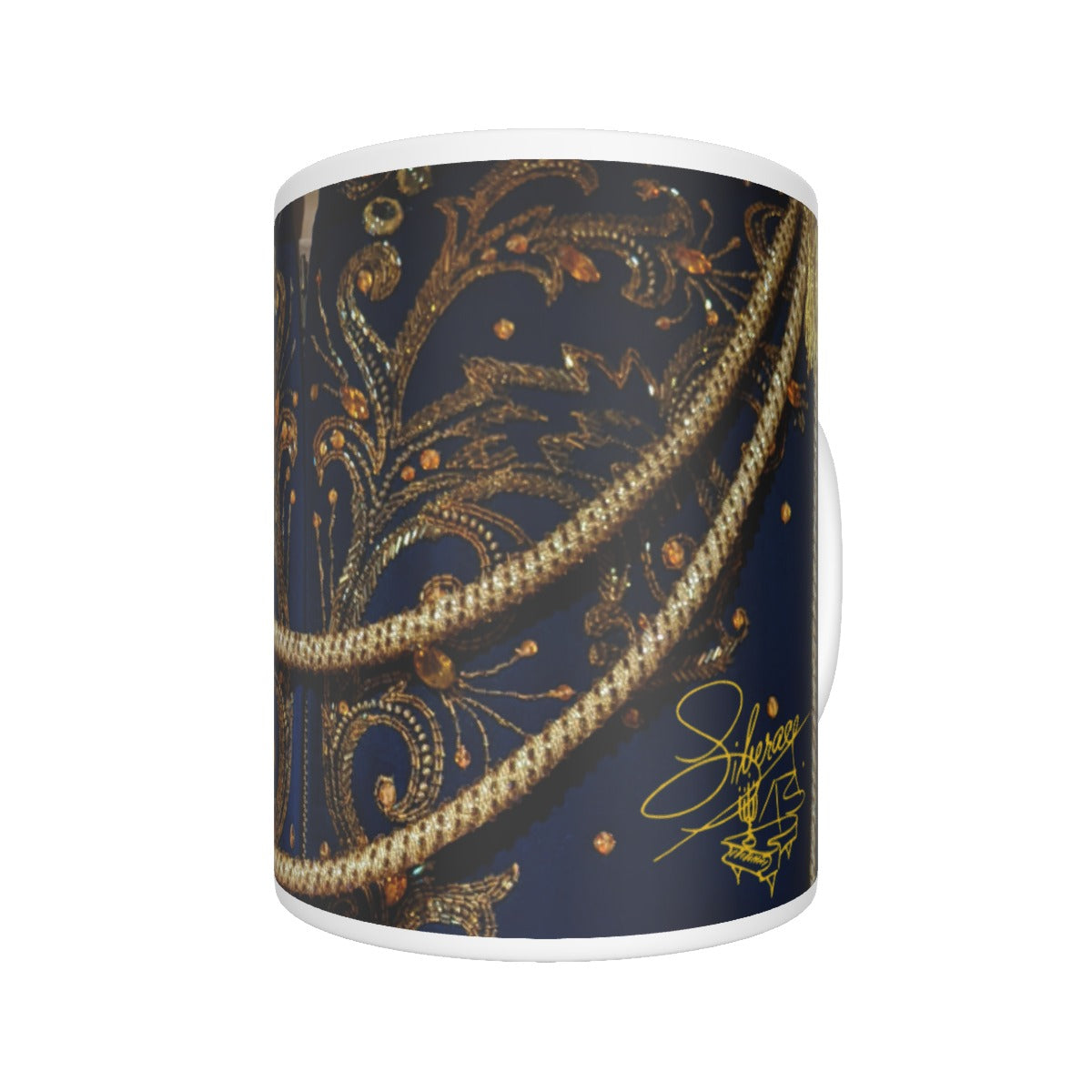 A copyrighted photo by the Liberace Foundation wraps this mug is great detail of the costume Liberace wore for his Dancing Waters concerts and others, the Blue Military Aiguillette by Michael Travis. See the original costume with the Liberace Museum Collection. A gold Liberace Piano Signature Logo also adorns the lower quarter. One of several unique mugs, collect them all!