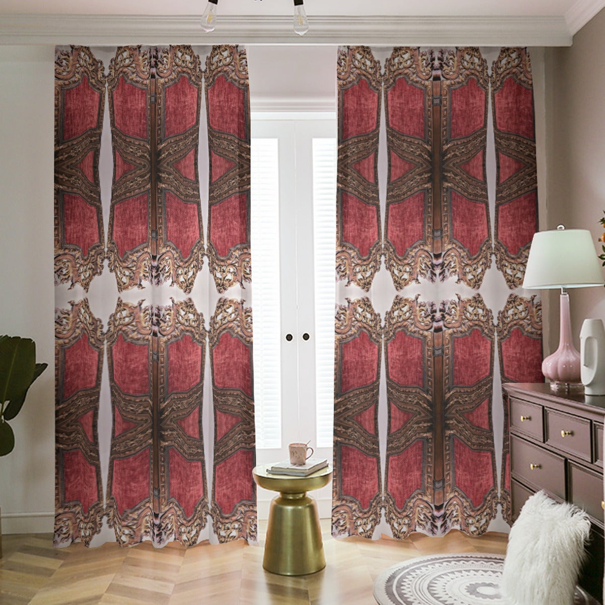Liberace's Napoleon Suite, at his home called The Cloisters in Palm Springs, was furnished with Napoleonic artifacts. One such artifact was a screen bearing a crest of the Emperor Napoleon. A copyrighted photo of that screen is patterned to create these elegant curtains. See the original screen in the Liberace Museum Collection.