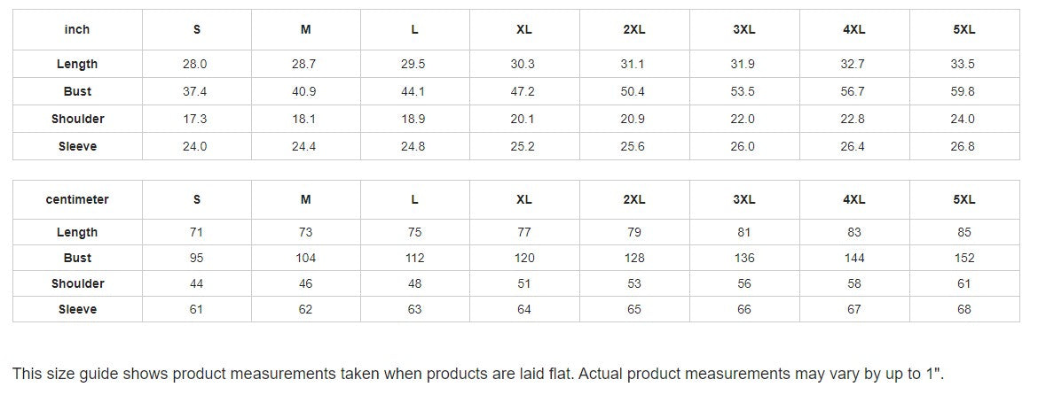 | centimeter | S | M | L | XL | 2XL | 3XL | 4XL | 5XL |