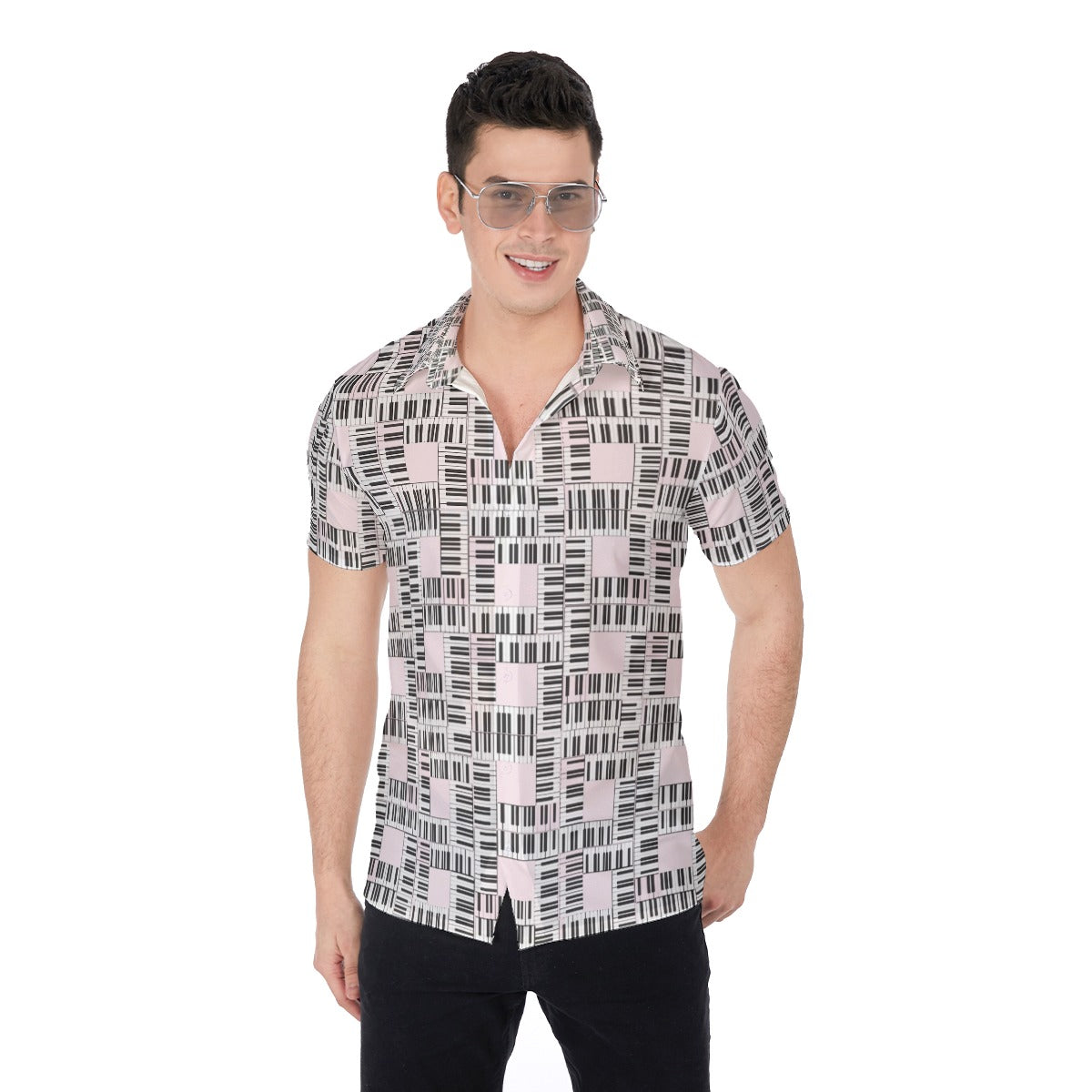 Inspired by the Annie Leibovitz photo of Liberace wearing a piano key pattern shirt, standing next to his bath tub in Las Vegas, this piano key pattern men's V-neck button-down is light and comfortable fabric, short sleeves. Other models are available too!