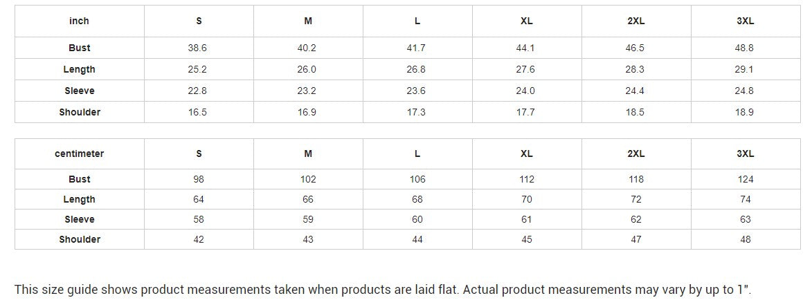 | centimeter | S | M | L | XL | 2XL | 3XL |