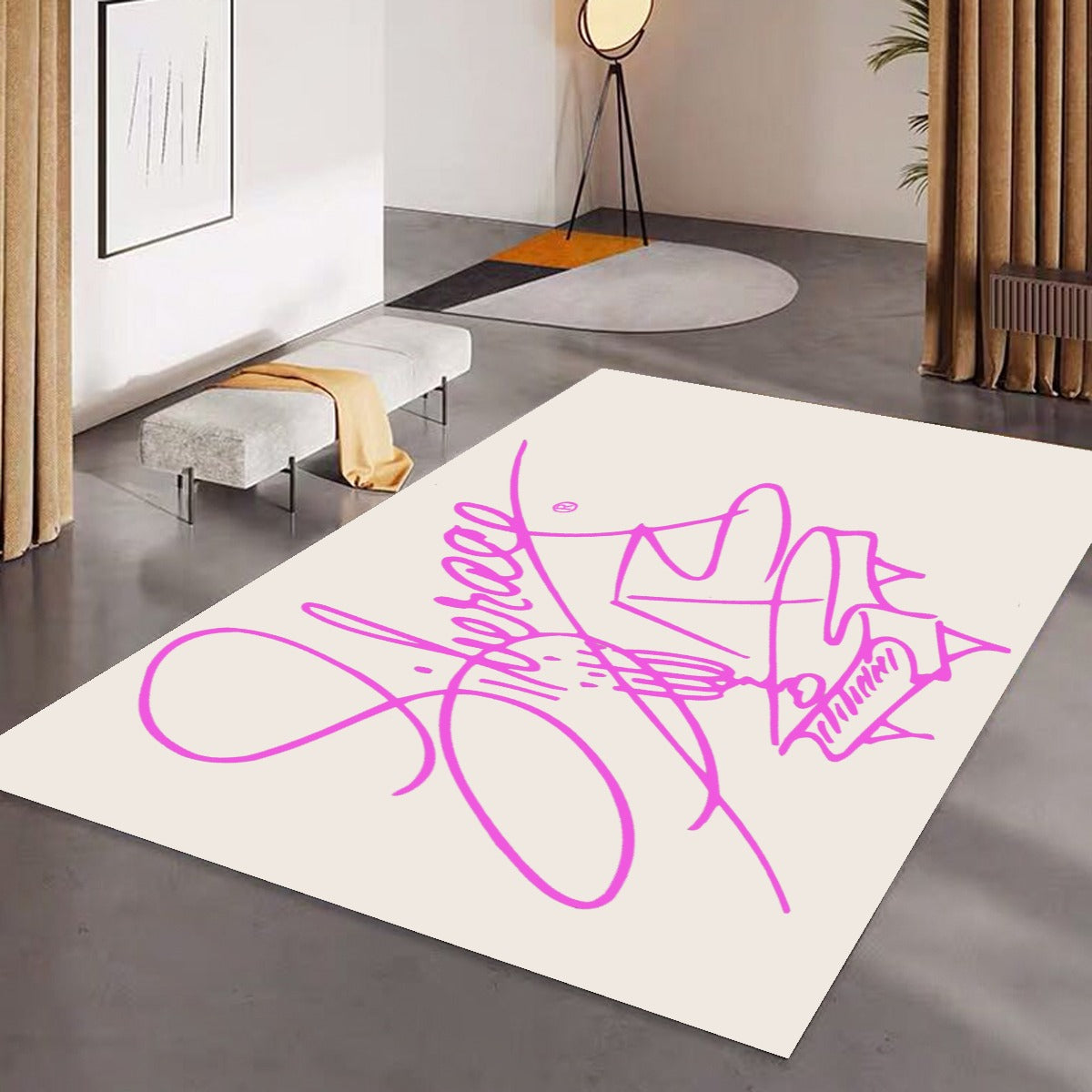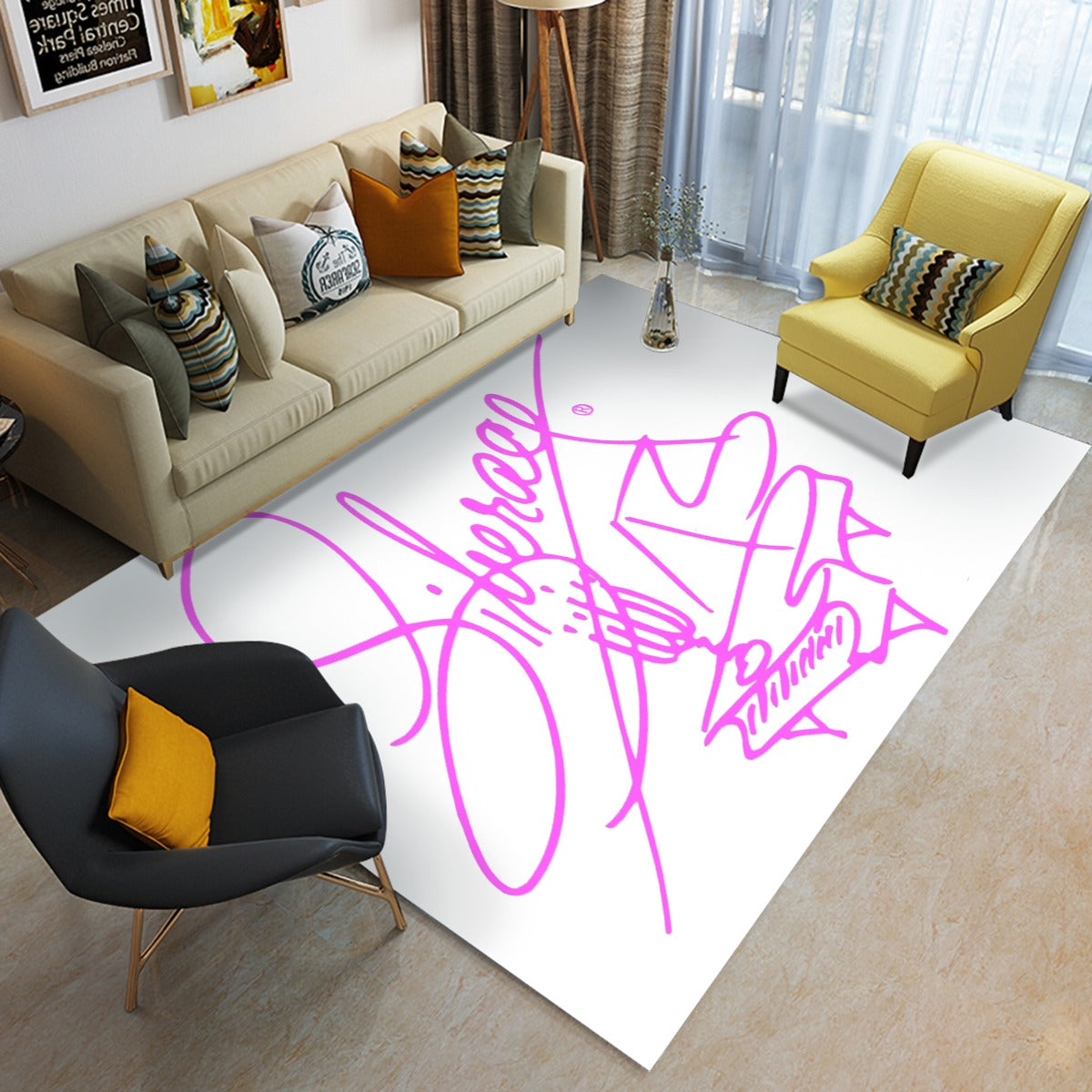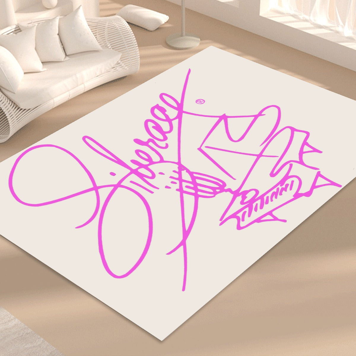 A massive pink version of the Liberace Piano Signature Logo, emblazoned across this super-soft polyester area rug