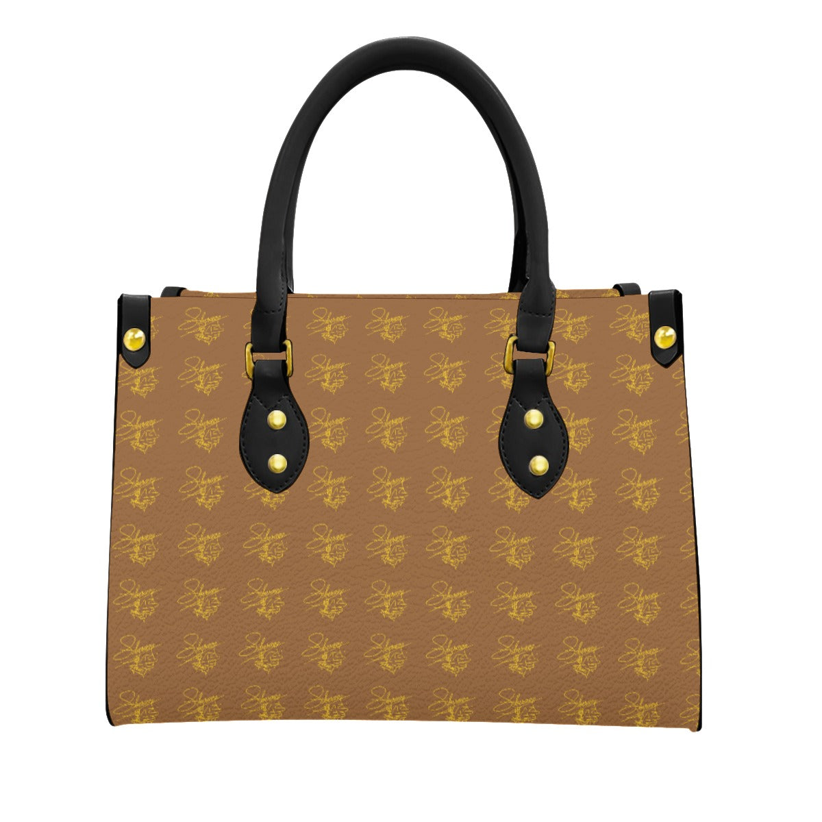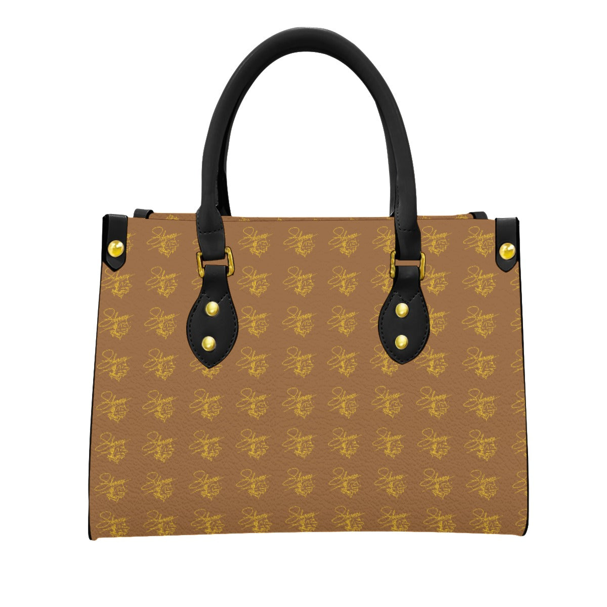 Liberace's classic piano signature became his trademark, and remains so after over seven decades. As a pattern, it covers this classic handbag with gold pattern over light brown. Black handles and trims are fastened and embelished with gold tone rivets and buckle links.