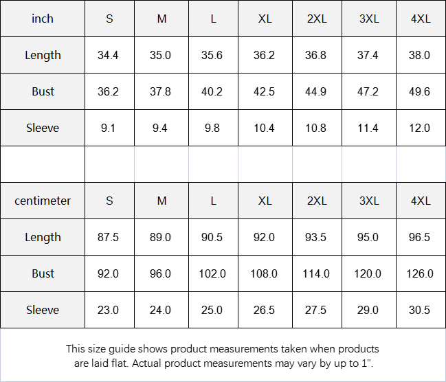 | Bust | 92.0 | 96.0 | 102.0 | 108.0 | 114.0 | 120.0 | 126.0 |