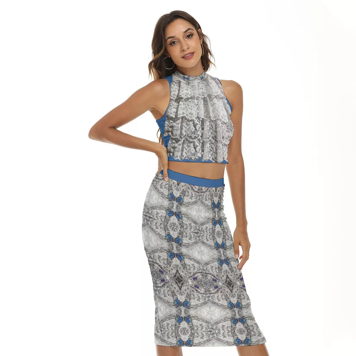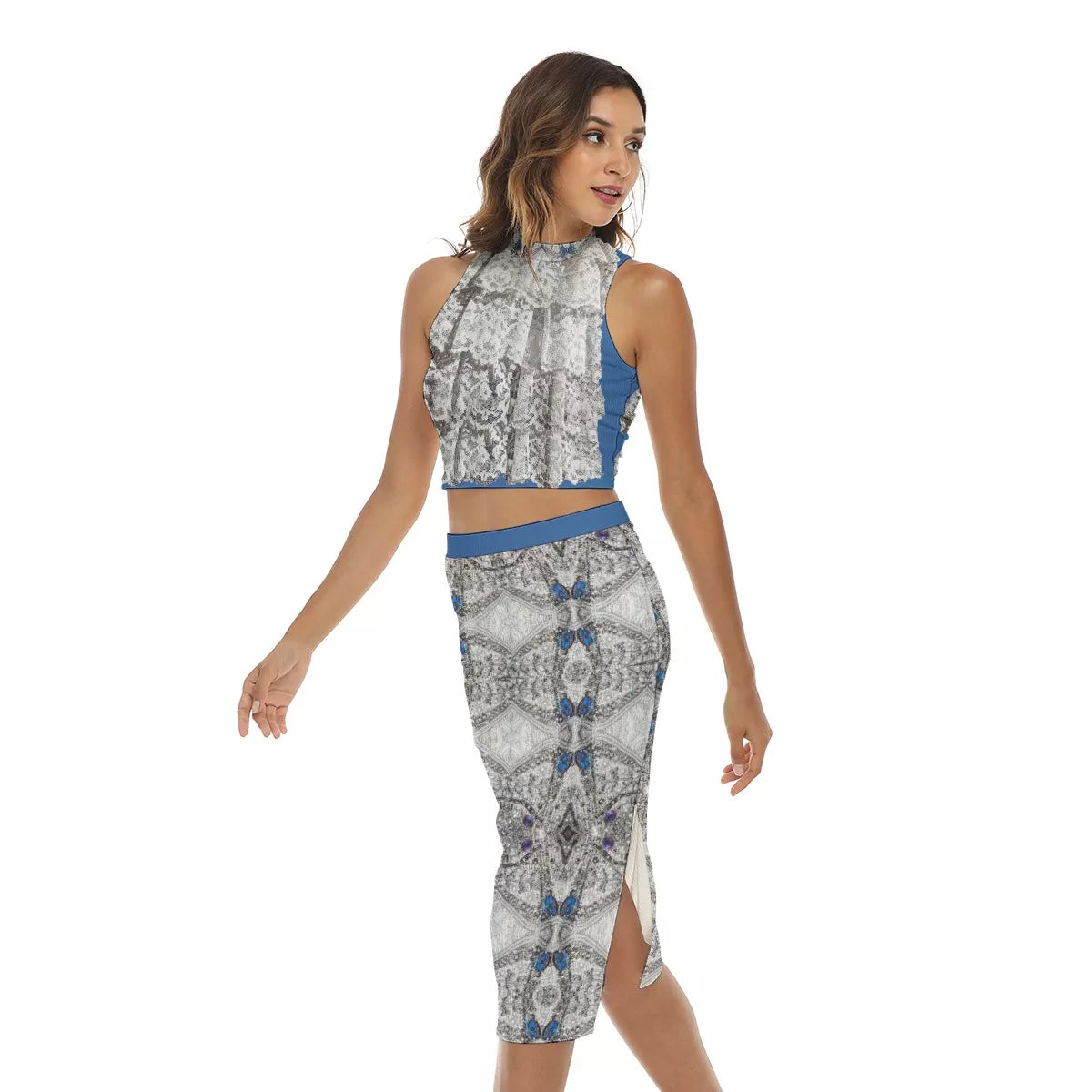 The top is printed with Liberace neck ruffles, a copyrighted Foundation photo of his actual costume. The below-the-knee skirt is slit toward the hip, and printed with a pattern of Liberace's 1978 bejeweled ostrich feather cape designed by Michael Travis. The original cape is exhibited with the Liberace Museum Collection. You're wearing legendary, timeless design, morphed into today's fashion. Completely unique.