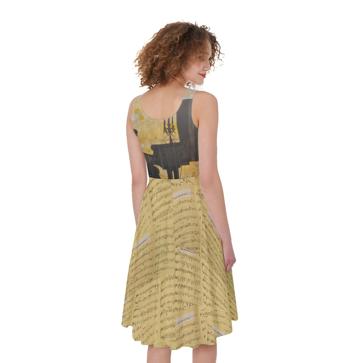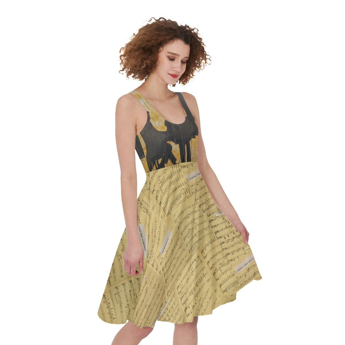 The copyright photograph, of the handwritten Liberace arrangement of Leonard Nimoy's 1967 Music From Outer Space, wraps the this A-line dress. Paulina Biggs Sparkuhl's "Unmistakable" silhouette painting is printed on the bodice. An absolute one-of-a-kind musical time capsule.